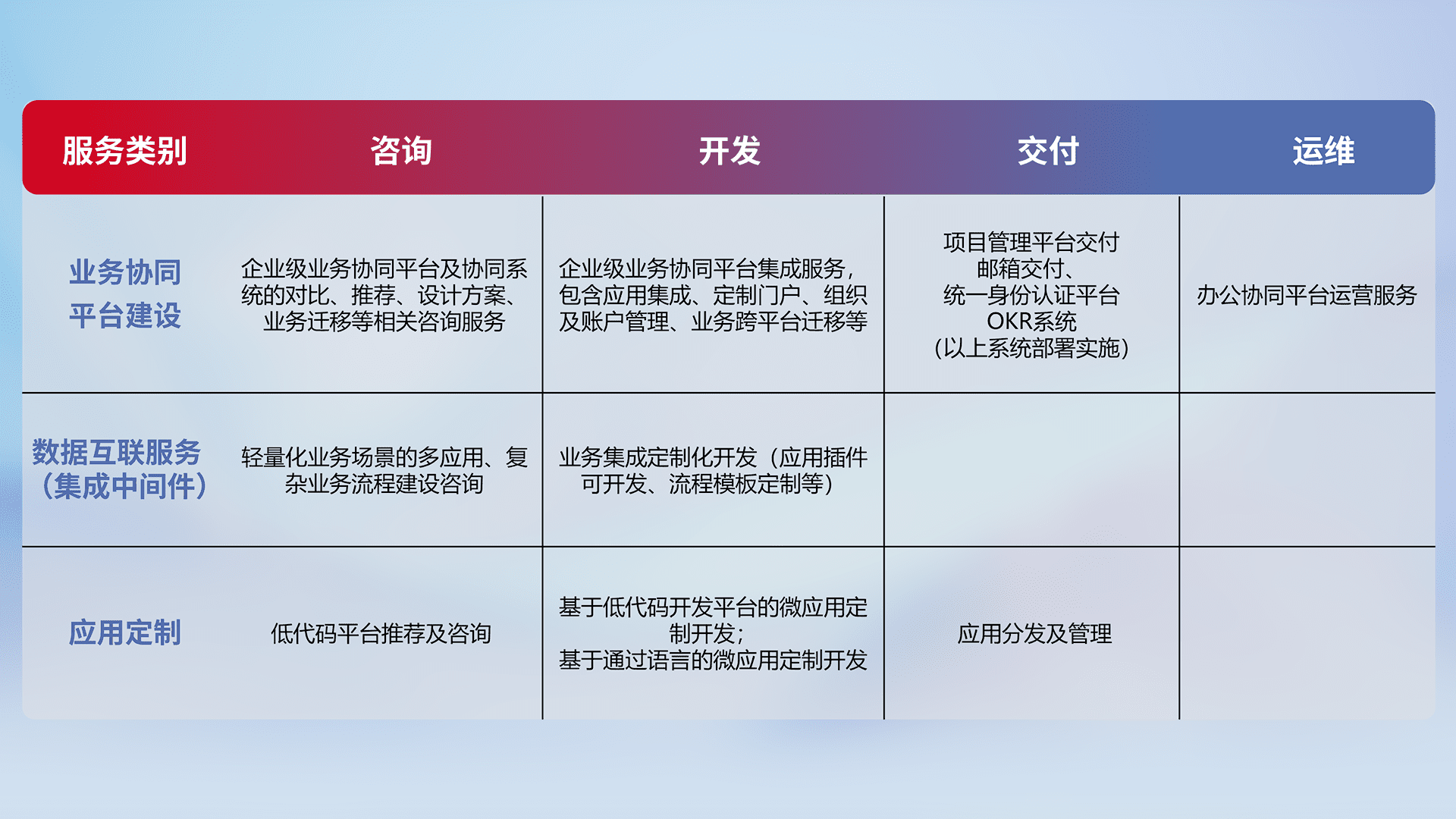 针对钉钉、、、、企微、、IDaas等平台级产品提供产品的规划、、、、方案、、交付、、、、定制化开发等服务,,,,实现如统一协同办公、、、智能客户服务、、、、混合会议管理、、、、智能数据查询、、、等业务场景,,,,实现数字化转型。。。。