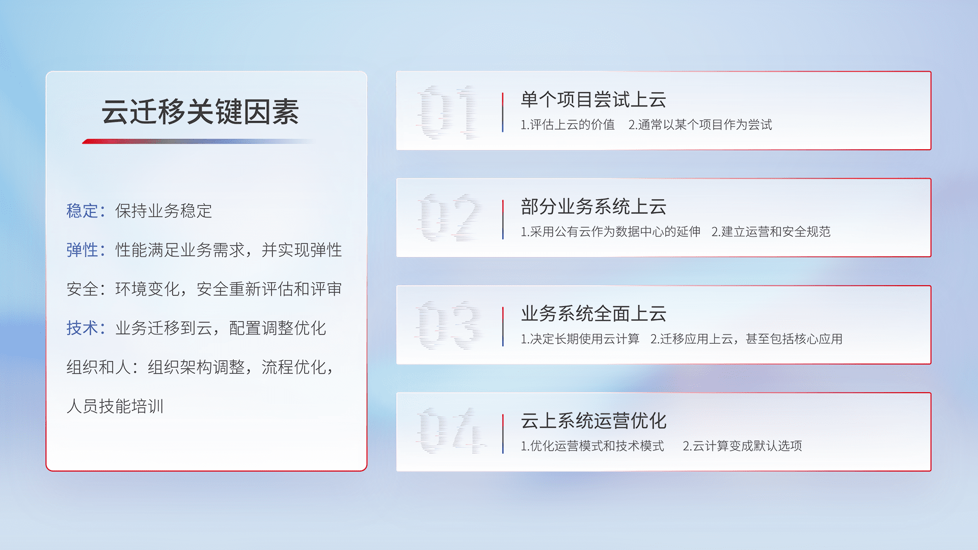 结合实际业务,,从规划设计、、、、云平台选型、、、云原生改造、、、、数据迁移、、集成交付,,迁移全过程为客户识别最佳上云路径,,,做好风险识别管理,,,,设计网络架构、、身份权限、、、安全审计合规、、、操作审计、、日志审计、、监控告警策略、、、、多站点容灾设计等,,,对云上基础设施进行整体规划,,提升IT治理水平,,以满足弹性、、高可用、、高性能的需求。。