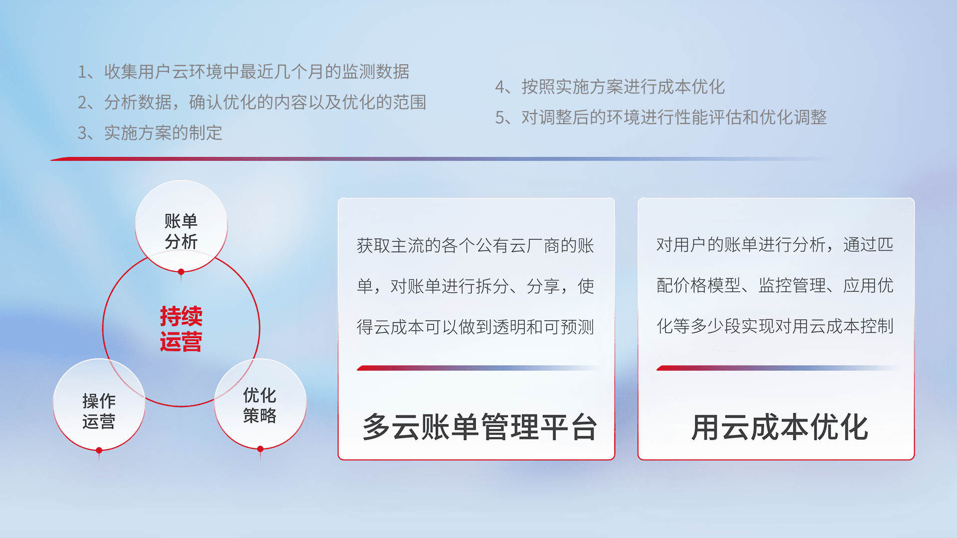 通过多云纳管,,以统一的资源数据模型把客户的云资源进行抽象和封装,,,,进而实现对多云资源的统一操作,,,保障云资源管理的可靠性、、、稳定性与可用性。。量身定制化运维内容,,,配置、、、开发运维、、补丁管理、、、备份、、、、监控、、、、认证和访问管理、、审计和日常巡检等,,保障在用云过程中的可靠度,,稳定度以及高可用率。。。。