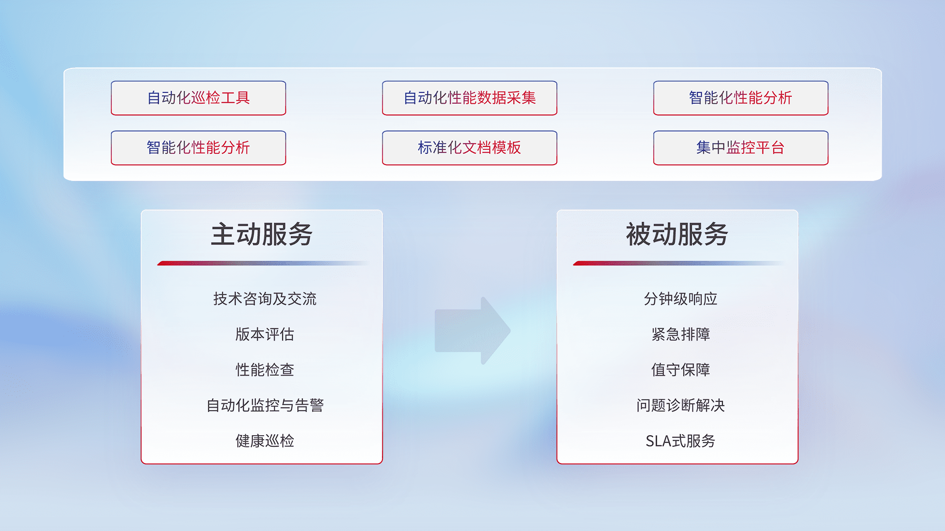 智能化工具和标准化文档,,保障服务质量,,,提供主动服务(包含技术咨询、、、版本评估、、、性能检查、、、、自动化监控与告警、、、健康巡检)和被动服务包含(分钟级响应、、、、紧急排障、、值守保障、、、、问题诊断解决、、、、SLA服务)。。。。